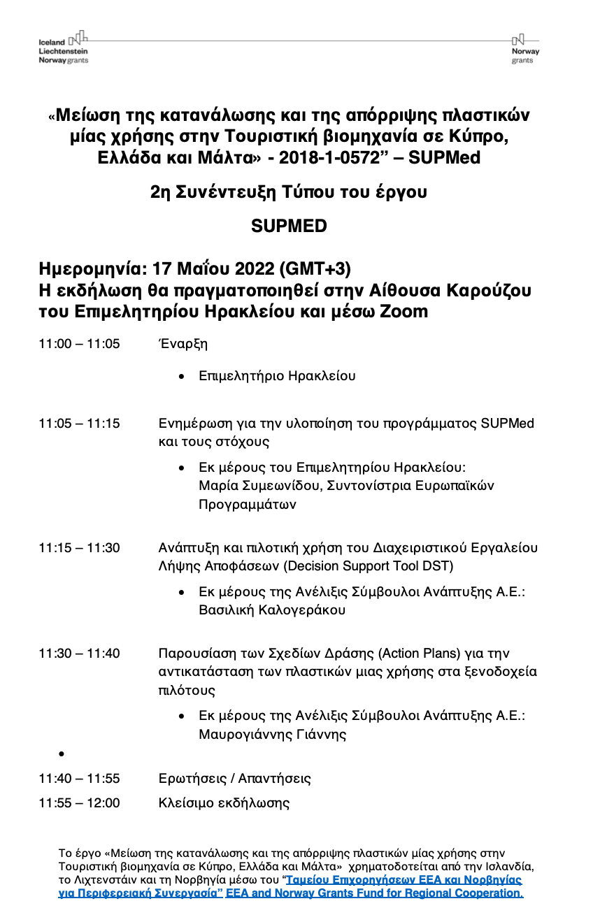 «Μείωση της κατανάλωσης και της απόρριψης πλαστικών μίας χρήσης στην Τουριστική βιομηχανία σε Κύπρο, Ελλάδα και Μάλτα» - 2018-1-0572” – SUPMed